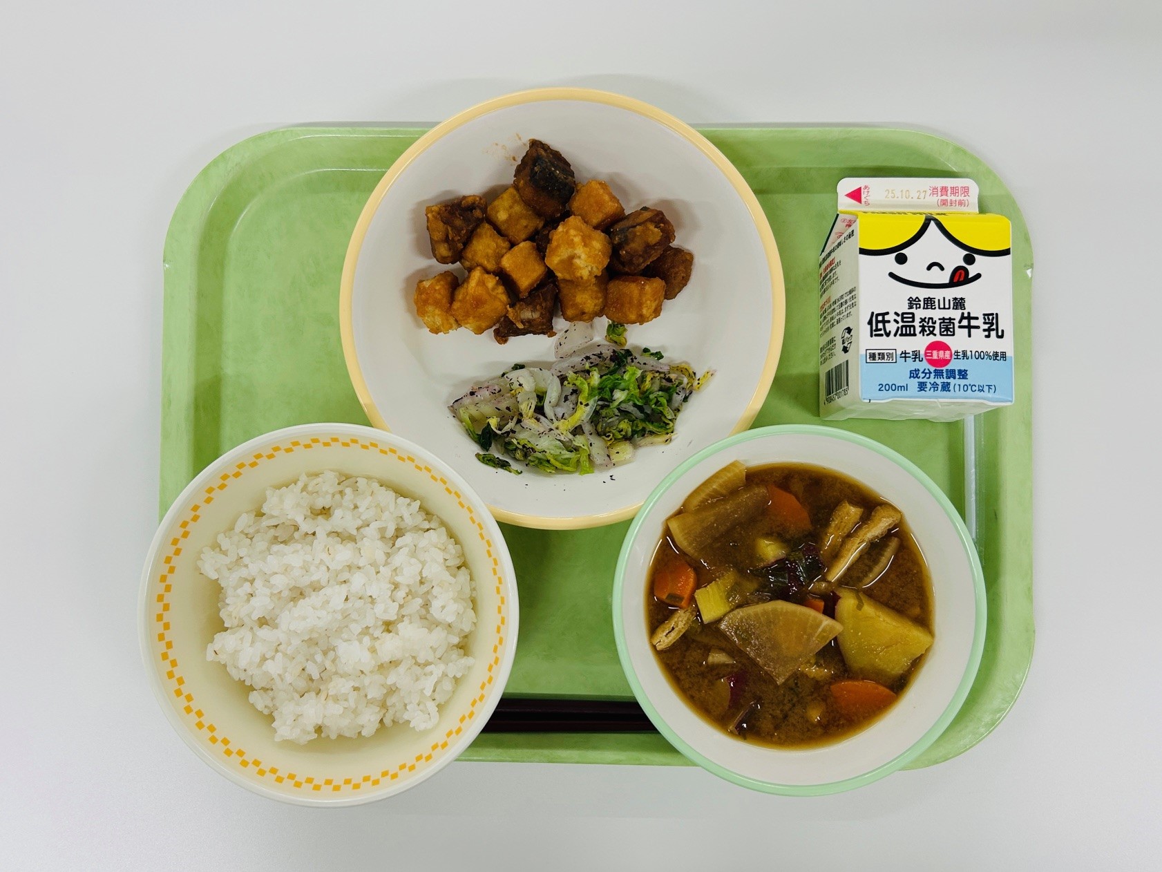 かつおと高野豆腐のオーロラソース、ゆかりあえ、さつま汁、米飯、牛乳