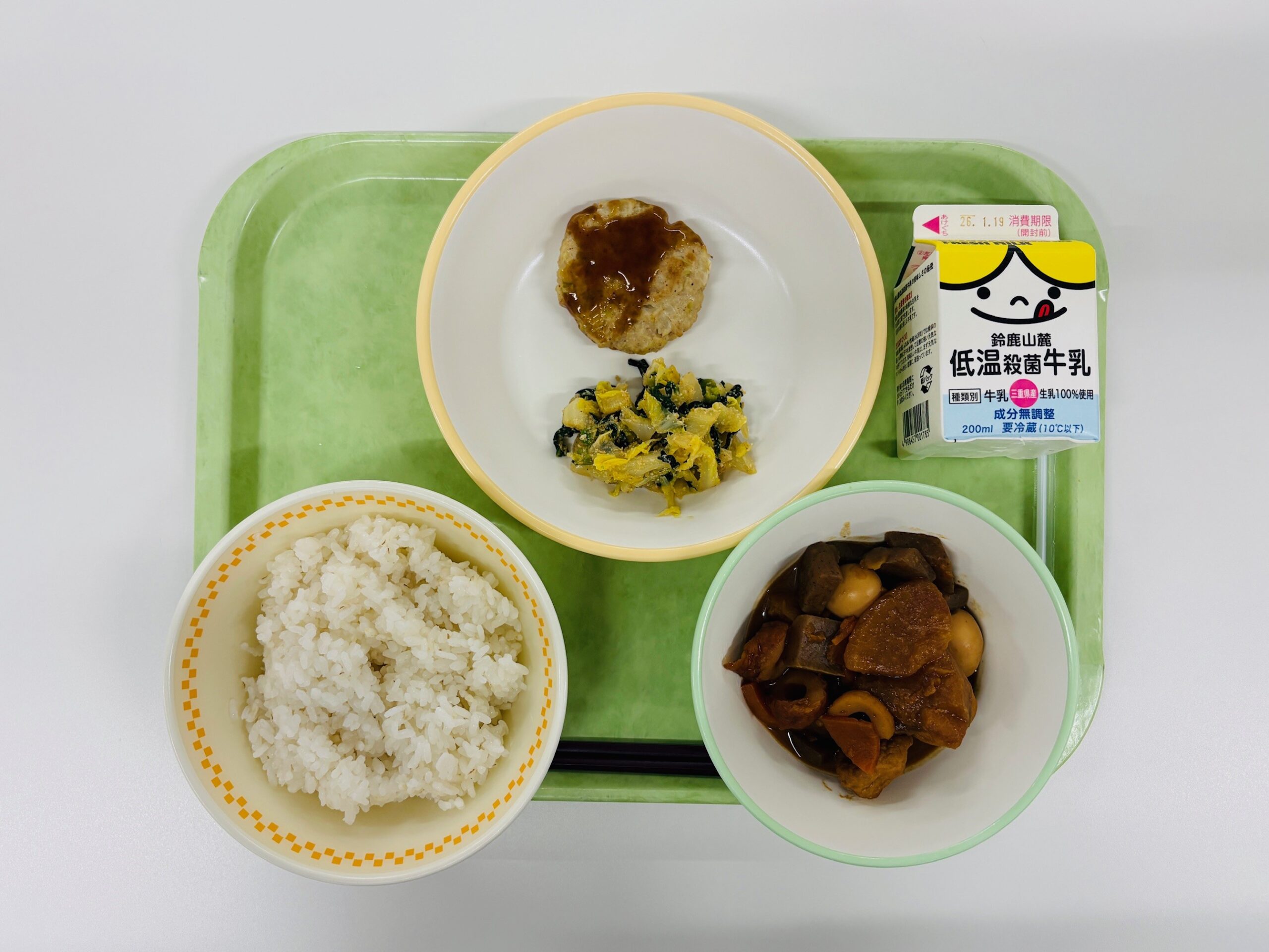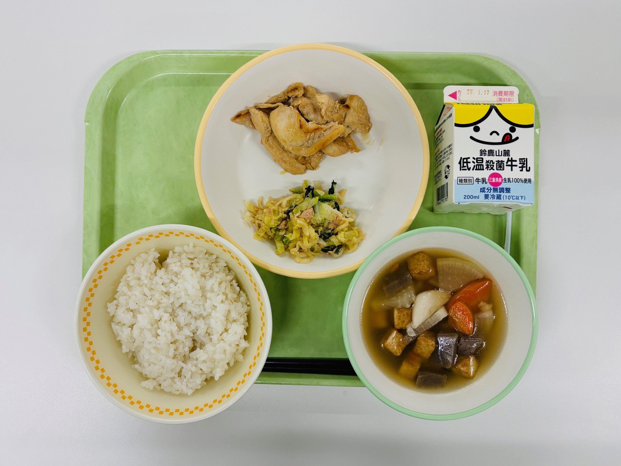 鶏肉の照り焼き、切干大根のサラダ、のっぺい汁、米飯、牛乳