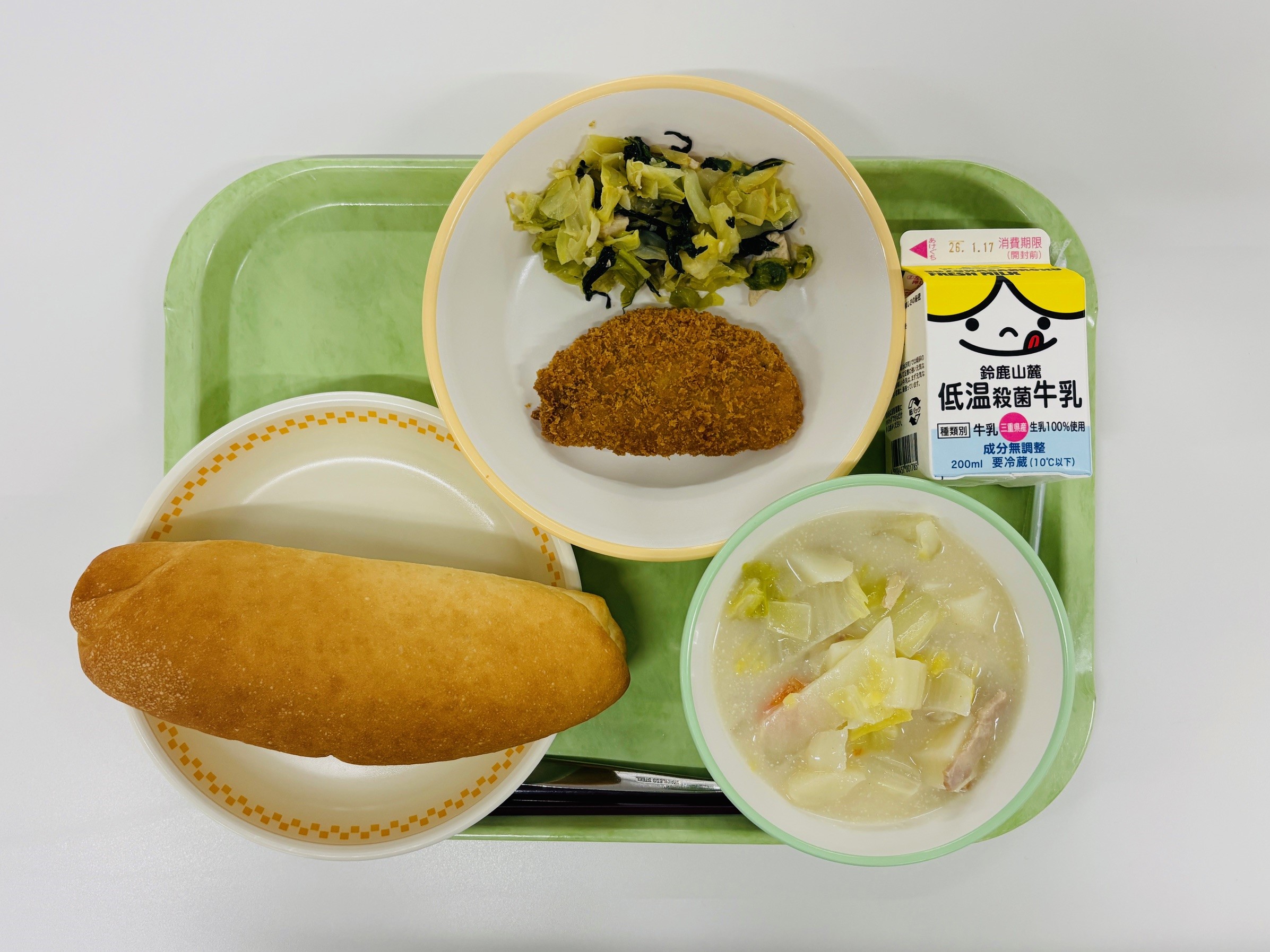 あじフライ、ガーリックソテー、白菜の豆乳チャウダー、米粉パン、牛乳