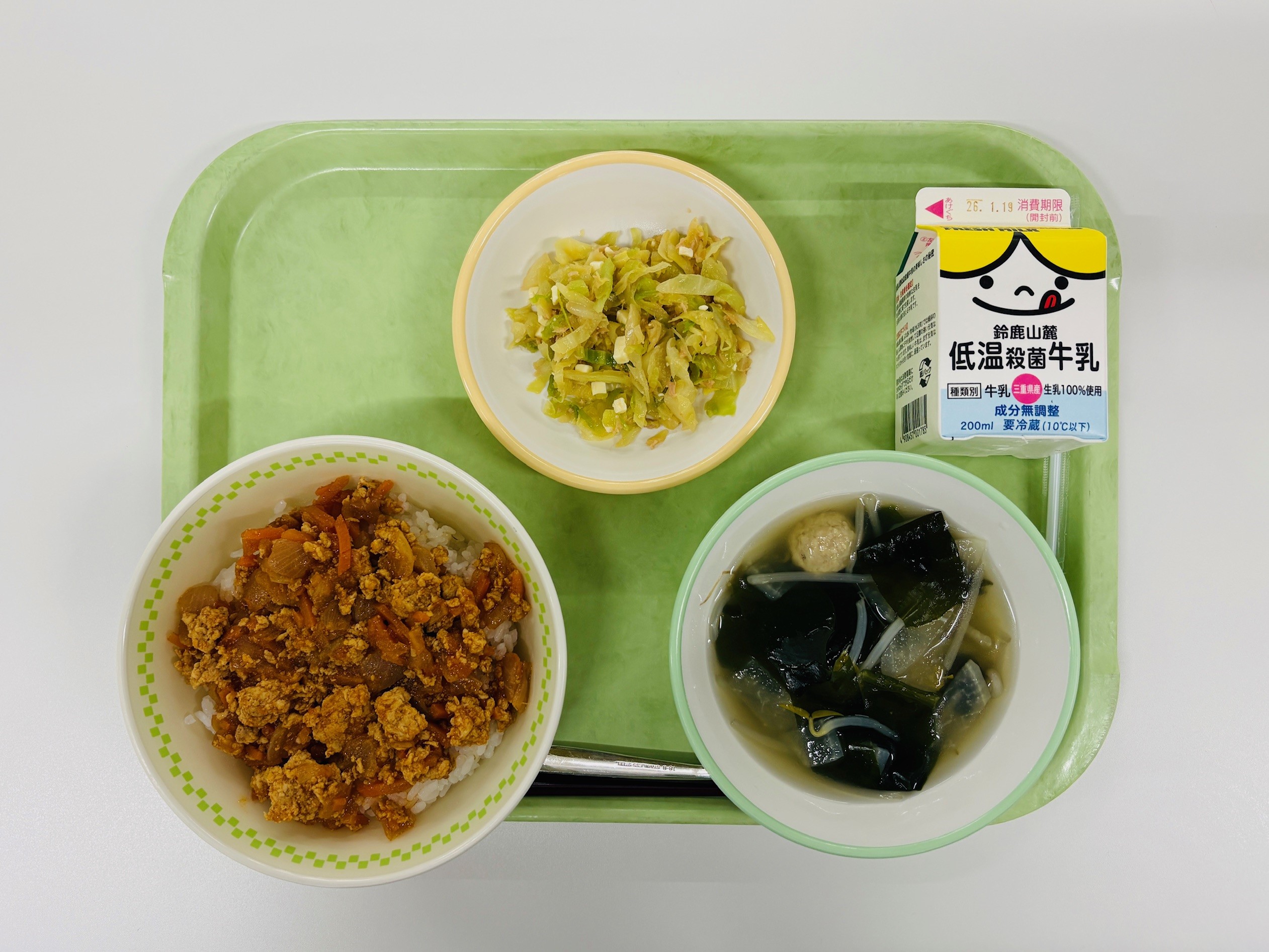 手巻きごはん(鶏そぼろ・ツナサラダ)、地物いっぱい沢煮椀、牛乳