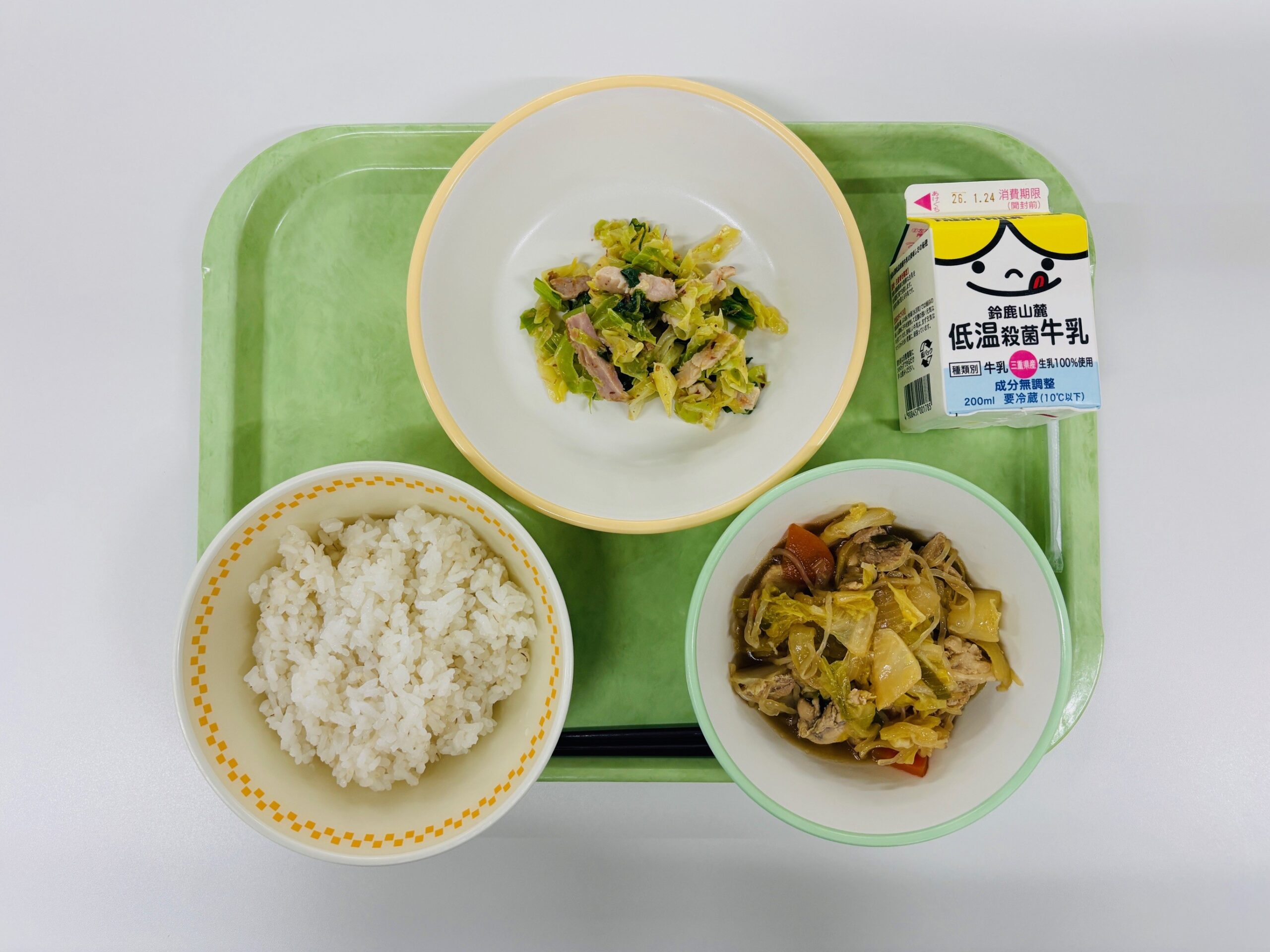 鶏すき、なばなのおかかあえ、米飯、牛乳