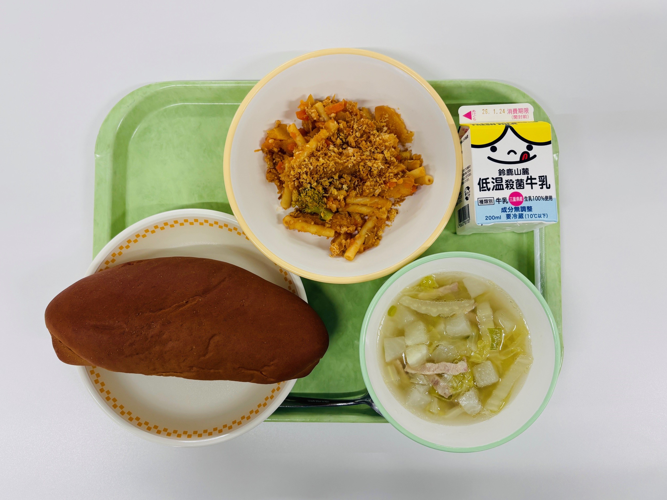 ミートソースのグラタン風、しょうが入り冬野菜スープ、黒糖パン、牛乳