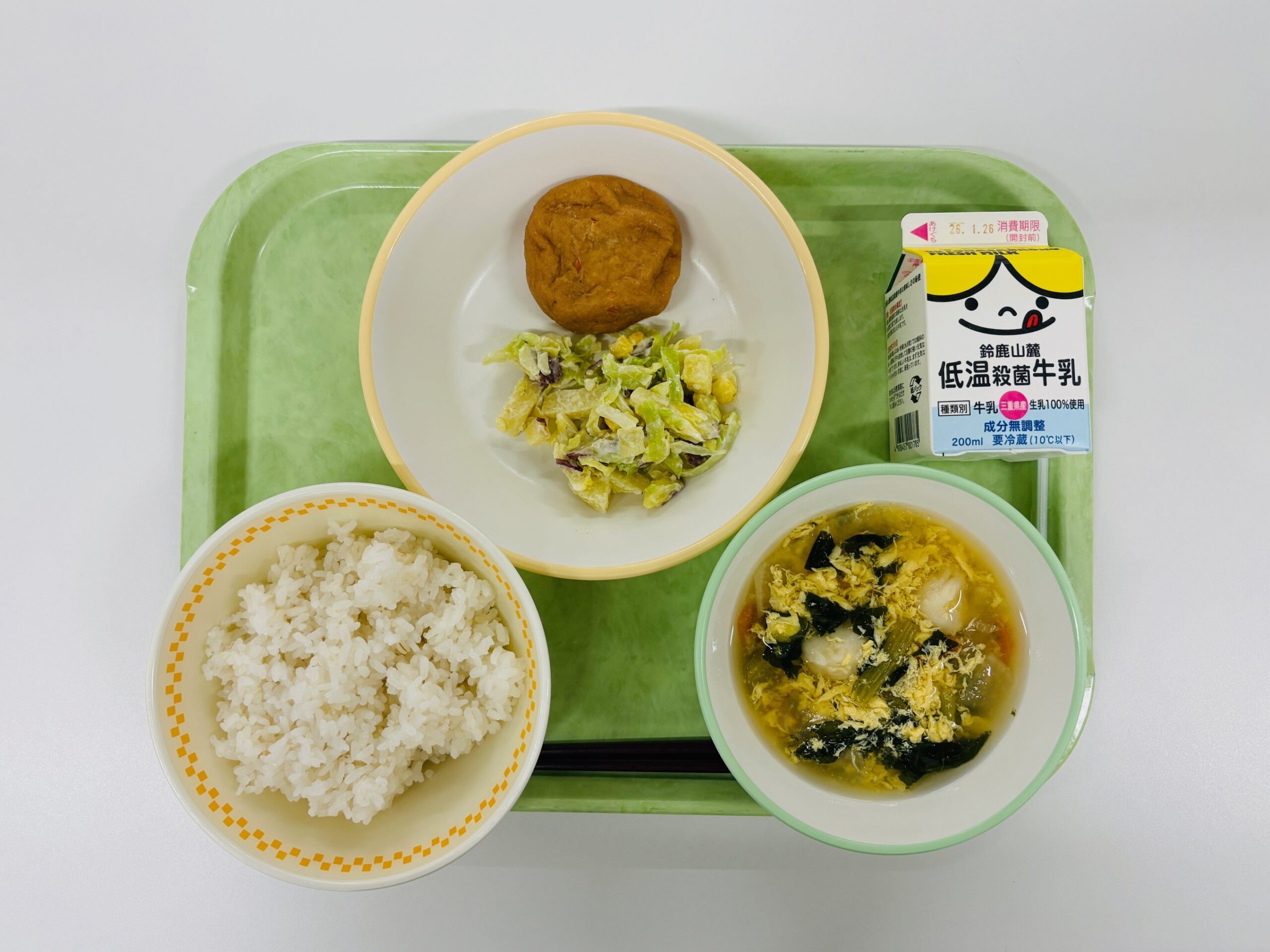 がんもどきの煮つけ、さつまいもサラダ、かきたま汁、米飯、牛乳