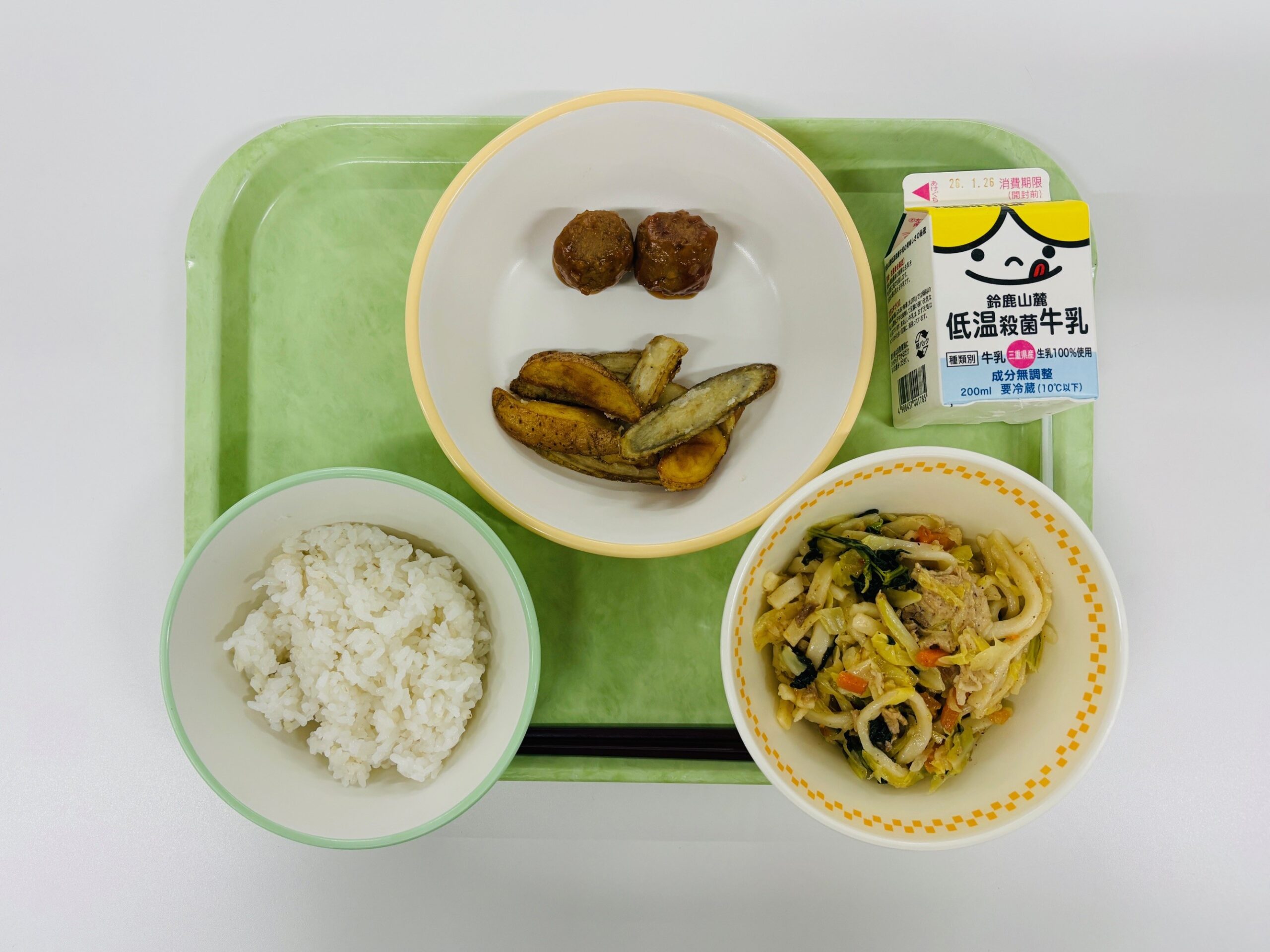 焼きうどん、肉団子の甘酢あん、フライドベジタブル、米飯、牛乳
