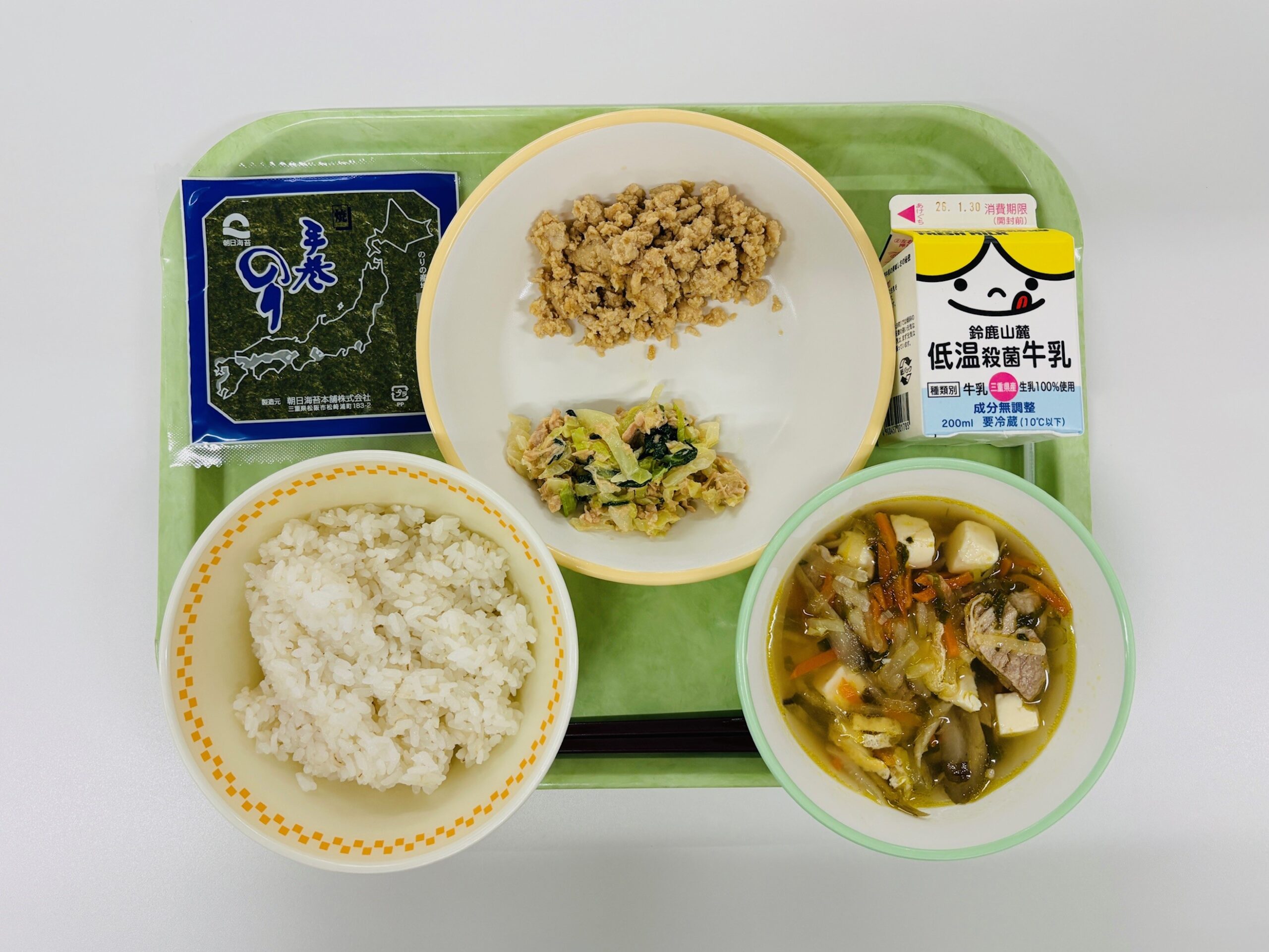 さばの塩焼き、のりあえ、豚汁、米飯、牛乳